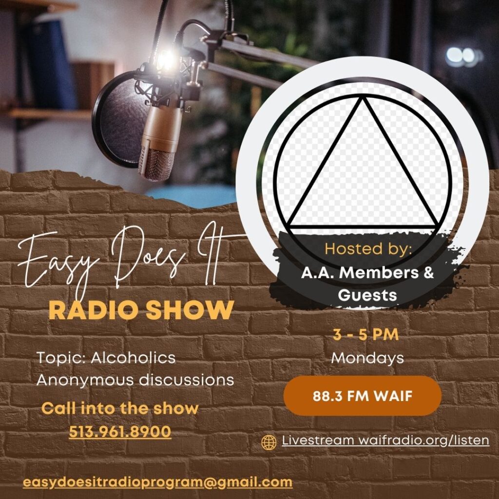 The Easy Does It Radio Program is a way for A.A. in Cincinnati to help carry the message to the Alcoholic who still suffers through its Public Information Committee. It is a production of the Greater Cincinnati Intergroup and hosted by A.A. members. We open with the Serenity Prayer, Daily Reflections and then have a topic for discussion each week. There are up to 5 people in studio every Monday who will share their Experience, Strength & Hope during the 2 hour time frame (from 3-5pm) on WAIF 88.3 FM or streaming on waifradio.org/listen.