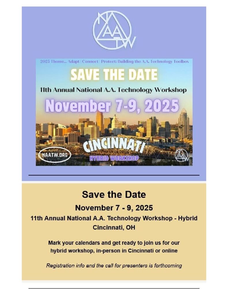 Adapt/Connect/Protect:Â Building the A.A. Technology Toolbox Hybrid Conference — In-Person and Online attendance options are available. Go to naatw.org for additional details.