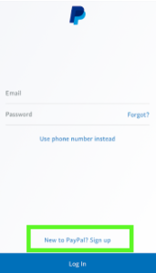 - Select ‘New to PayPal? Sign up’ link on bottom of screen.
