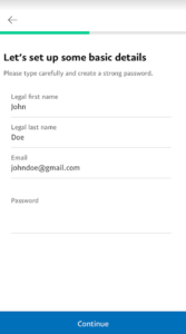 - The next screen will prompt you to enter your first name, last name, email address and a password for your account.