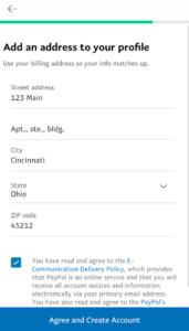 - Next screen will ask for your address. You will need to enter your address, click on agreement check-box, then select “Agree and Create Account”.