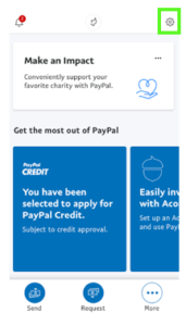 - Once you are in the PayPal App, select the gear in the top right corner (to go to Settings)