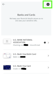 - Click on ‘+’ button in top right – follow prompts to add Bank Account or Credit/Debit card